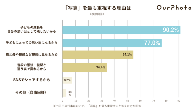 七五三行事行事において最も重視するのは「写真」(90.2%)で、その理由は「子どもの成長を自分の思い出として残したいから」「子どもにとっての思い出になるから」という理由が多いことがわかった。