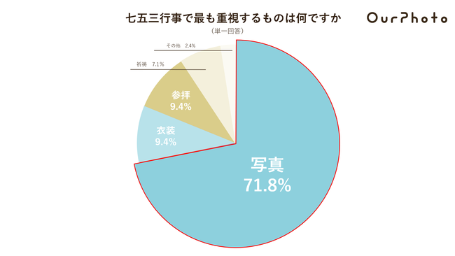 <結果1>七五三行事において最も重視しているものは、「写真」(71.8%)が最も多い結果に。次いで2位が「衣装」「参拝」(9.4%)