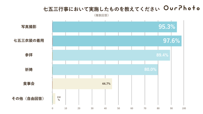 子どもの成長を祈願する七五三ですが、参拝(21.8%)や祈祷(19.5%)よりも、写真撮影や衣装の着用がやや多い結果に。子どもの成長した姿を思い出として写真に残したいという傾向がみうけられる。