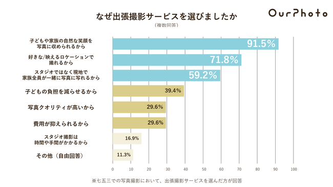 7. 撮影方法に「出張撮影サービス」を選んだ理由で最も多かった回答は、「子供や家族の自然な笑顔を写真に収められるから」(91.5%)。