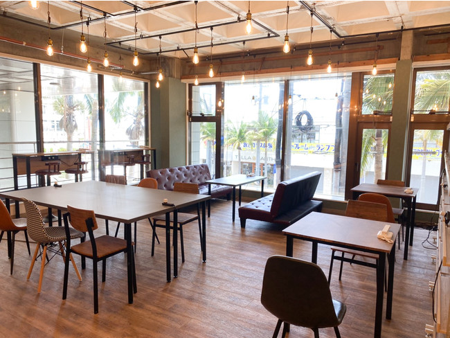 アメリカンビンテージ風の空間は、全面ガラス張りの窓から南国らしいヤシの木と、ちょっと海も見える開放感を感じられます。