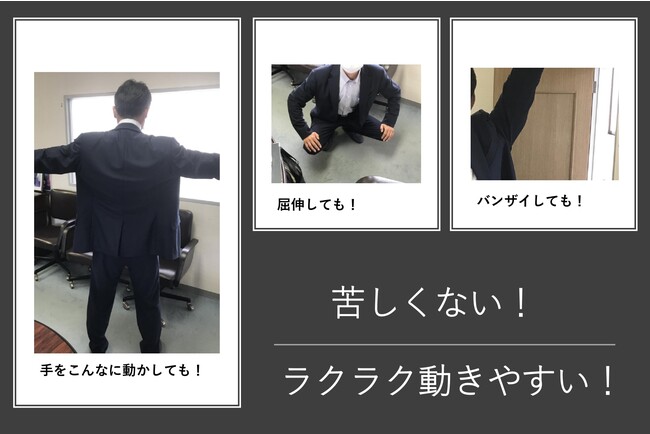 学校の教師やビジネスマン、営業マン、ドライバー、セレモニーのカメラマンなどは、しっかりとビジネス感のある服装をしなければならないけど、アクティブに動き回ります。肩回りや足腰がキツく、動きづらいと感じるというお悩みでした。