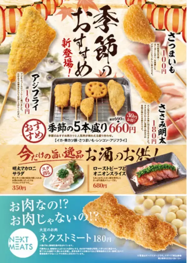 串カツ田中では常時約30種類の串カツを提供しており、さらに季節ごとに新メニューを販売し、新たな串カツ田中の味をお楽しみいただけます。この新メニューをきっかけに、これまで串カツ田中を利用されたことのない方にも来店いただきたいと考えています。また、串カツ田中ファンには新たな串カツの美味しさを感じていただきたいと考えています。