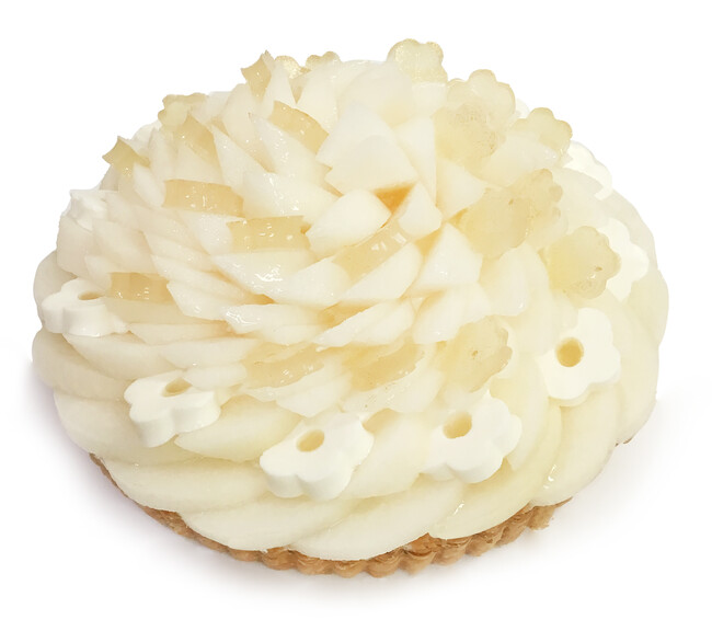 市場にほとんど出回っていない、新潟県産梨「新美月/新王」をふんだんに使用し、梨の花のイメージを模ったまろやかな甘みの練乳ムースとはちみつゼリーと共に飾り付けました。シャキシャキとした食感とマスカルポーネが相性抜群なケーキです。期間中、新美月から新王へとリレー方式で展開します。