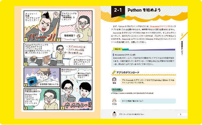 Python初心者であるプログラミング部と一緒に学ぶことで、初学者がつまづきやすいポイントも楽しく学習を進められるよう工夫されており、最後には人工知能による大喜利アプリが作れるまでに到達することが出来ます。