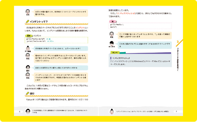 プログラミング部と先生が会話をしながら学習を進めていきます。会話を通して学習のPythonの知識を深めていきましょう。