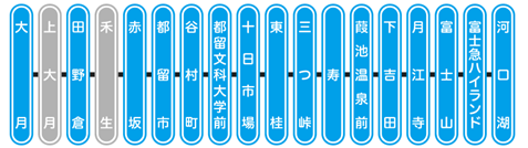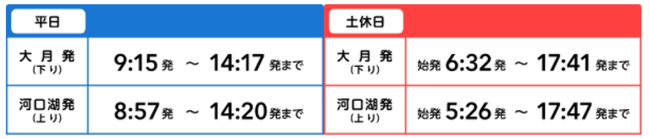 ※特急列車(富士回遊、富士山ビュー特急、フジサン特急)及びJR線直通列車(河口湖10:40発高尾行き、土休日は河口湖5:49発・6:15発東京行きと大月8:19発河口湖行き)はご利用できません。