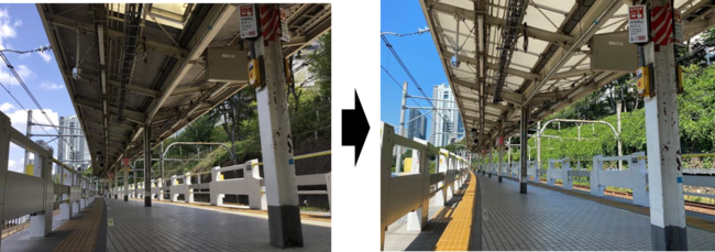 駅プラットホームでの工事は、鉄道の利用がない深夜時間帯しか進めることができないため、短期間で一定部分の工事を速やかに進める工法が必要となります。新工法は、1日あたりの施工面積が12~18平方メートル となっており従来工法に比べ30%程度作業効率が向上しています。また、JR東日本高輪ゲートウェイ駅や東京駅八重洲口グランルーフなどにも採用された膜素材の特徴を生かして開発した新素材を採用しており、金属屋根と同等の耐久性をもちながら採光豊かで明るく美しい景観を実現します。