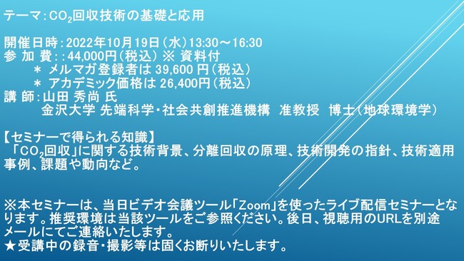 先端技術情報や市場情報を提供している(株)シーエムシー・リサーチ(千代田区神田錦町: https://cmcre.com/ )では、 各種材料・化学品などの市場動向・技術動向のセミナーや書籍発行を行っておりますが、 このたび「CO2回収技術の基礎と応用」と題するセミナーを、 講師に山田 秀尚 氏 金沢大学 先端科学・社会共創推進機構 准教授 博士(地球環境学))をお迎えし、2022年10月19日(水)13:30より、 ZOOMを利用したライブ配信で開催いたします。
