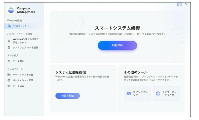 専用ツールPassFab Computer Managementは、通常の操作では起動できないパソコンを起動させたり、ロゴの表示でフリーズする不具合を修復できる強力なツールです。専門的な機能により、様々な原因や状況で発生するWindowsの問題を安全に修復できます。また、分かりやすいガイドやデザインによって、誰でも簡単に使用することができます。パソコンの問題でお困りの場合は、ぜひお試しください。なお、対処のためにパソコンの初期化や復元ポイントへの修復が必要になる場合があります。突然のトラブルに備え、データの損失を最小限に抑えるためにも、日常的にデータのバックアップを取っておくことをおすすめします。