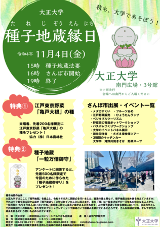大正大学(学長:高橋秀裕、所在地:東京都豊島区)は、大学と関連団体、学生が運営するイベントとして11月4日(金)に「種子地蔵縁日」を開催します。
