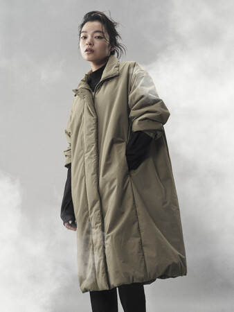 丸みのあるコクーンシルエットがフェミニンなPRIMALOFT(R)採用のスタンドカラーコート。幅広い着こなしに合うミニマルなデザインとミリタリーテイストなカラーリング。防水性・防風性を高めた2レイヤー生地はハリがありながらも柔らかい素材感。