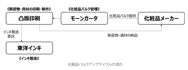 モーンガータは、化粧品メーカー各社(現在7社)から不要となった化粧品バルクや製品、化粧品小売店舗から廃棄予定の化粧品テスター、百貨店などで回収された一般消費者の廃棄化粧品を収集し、一括管理しています。印刷用インキ化においては、廃棄される化粧品バルクの管理ハブとしての役割を担い、印刷用インキ化に適したバルクを凸版印刷に調達します。さらに、凸版印刷が東洋インキに委託し製造したインキを用いて販促物・資材などを制作し、化粧品メーカーに販売します。