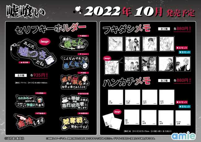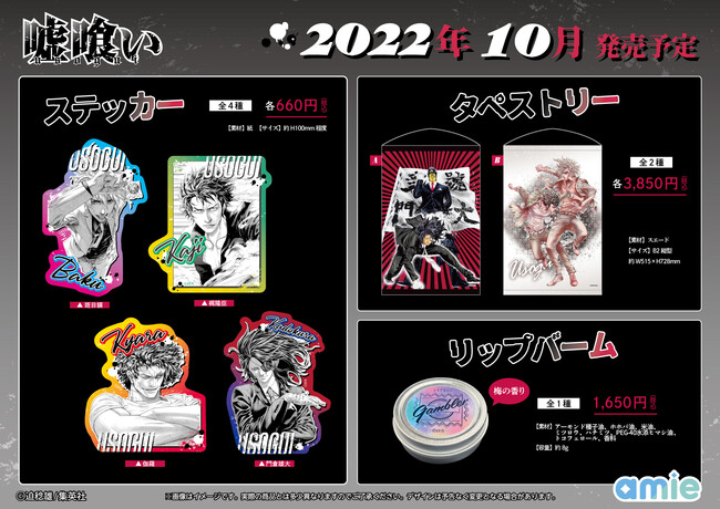 フィギュア&ホビー通販大手の「あみあみ」を運営する大網株式会社(本社・東京都文京区)は、自社が展開するキャラクターグッズブランド「amie(アミィ)」から漫画『嘘喰い』のグッズ9アイテムが、現在発売中です。