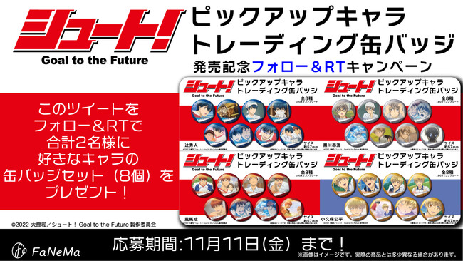 TVアニメ『シュート! Goal to the Future』より「ピックアップキャラトレーディング缶バッジ」の発売を記念して、Twitterフォロー&リツイートキャンペーンを実施いたします。