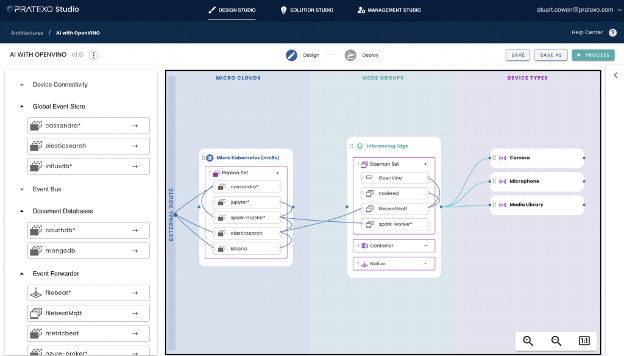 しかも、ローコード開発環境のPratexo Studioにより複雑なエッジソリューションの開発・運用を著しく簡素化・加速化することができます。ソリューションアーキテクトは、予め用意してあるデバイス、エッジノード、マイクロクラウドやソフトウエアコンポーネントをドラッグ&ドロップの操作でキャンバス上にデザインします。デザイン完了後、ボタンをクリックするだけで仕様書やインストールスクリプトを自動生成し、デジタルツインとして、或いは物理的環境にソフトウエアをデプロイできます。