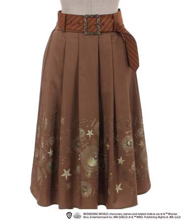 物語に登場するホグワーツ城や各寮のアイコン、輝く夜空のモチーフとミックスしたオリジナルプリントを作り、パネル柄に落とし込んだスカートです。