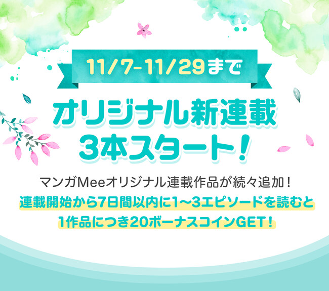 11月7日からオリジナル連載を続々と開始します。さらに連載開始から7日間以内に1~3エピソードを読むと1作品につき20ボーナスコインがもらえます。