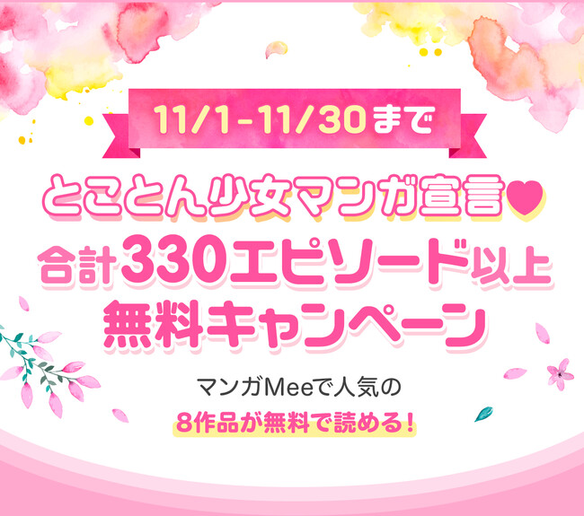 11月1日から30日までの期間限定で、合計330エピソード以上のマンガ作品が無料で読めるキャンペーンを行います。少女・女性向けマンガの最新話題作8作品が期間内に続々と無料公開され、楽しむことができます。