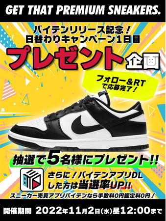 ・キャンペーン内容: バイテン公式Twitterアカウントをフォロー&該当ツイートをリツイートで抽選で人気スニーカーをプレゼント!プレゼント内容は応募期間につきましては該当ツイートをご確認ください。