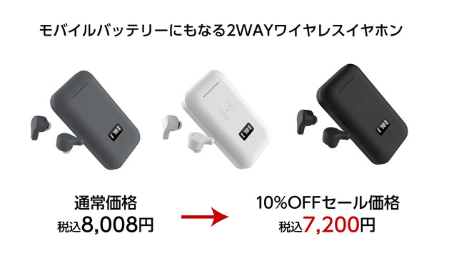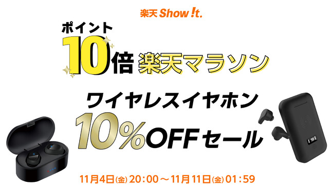 楽天市場「Show !t」は11月4日(金)20時から、ケースがモバイルバッテリーになる完全ワイヤレスイヤホンとシンプルな機能でコストパフォーマンスの高い完全ワイヤレスイヤホンの2種類を10%OFFで販売します。また、11月4日(金)20時~11月11日(金)23時59分まで開催されるポイント最大44倍楽天お買い物マラソンに参加し、全商品ポイント10倍プレゼント(一部商品を除く)を実施します。