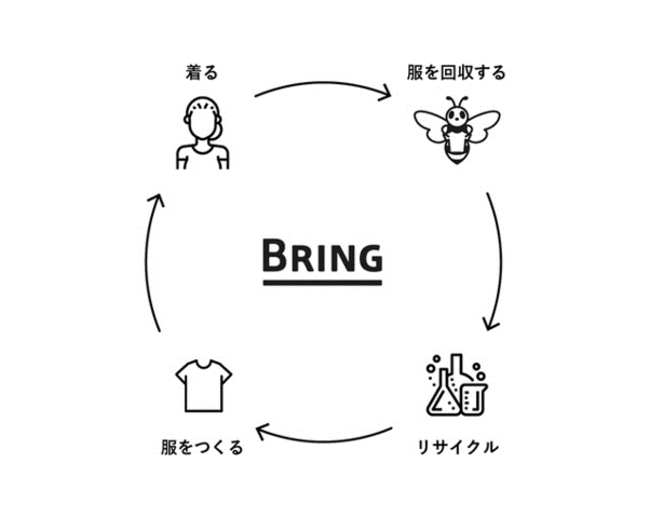 BRINGは服から服をつくるために、使われなくなった服を消費者から回収する活動を様々なブランドと連携して行っているブランドです。回収した服は独自のBRING Technology により科学的にリサイクルされ、まったく新しいポリエステル原料に生まれ変わります。