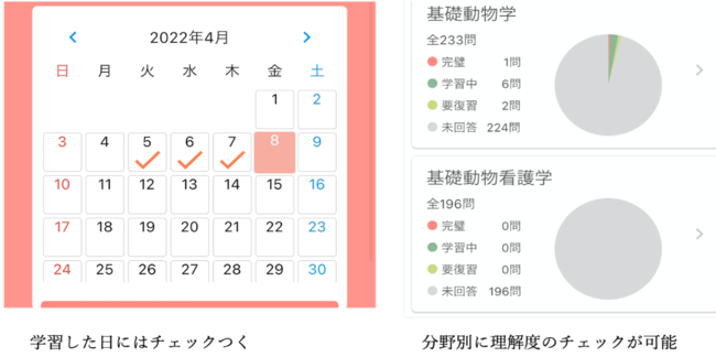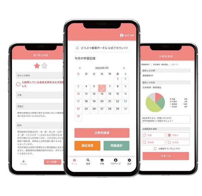 今回リリースしたアプリ「どうぶつ看護ポータル」では、問題演習を行い、更に苦手分野の視覚化や復習によって、日々の学習管理と国家試験の対策をサポートします。