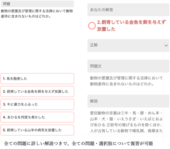 当社の運営する【愛玩動物看護師国家試験対策オンライン模試】の問題が当アプリで復習可能です。本番形式で挑戦した問題にも同様に反復学習に取り組んでいただけます。