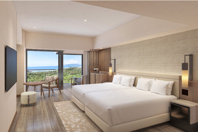 14・15階のクラブラウンジへのアクセス付客室62室が、やんばるを体験する「旅」の拠点に相応しい空間へと生まれ変わります。デイベッドとテーブルを備えたインナーテラスは、大切な人と過ごす特別な時間にふさわしい非日常の空間。壁一面に広がる大きな窓から、移り行く風景を堪能できます。備え付けられたバルミューダのザ・スピーカーが音と光でやさしく空間を演出してくれます。また、客室には、インルームダイニングでお気に入りのワインや泡盛をゆっくりと楽しむことができるダイニングテーブルを設置。ゆるやかに時が流れる空間で寛ぎのひとときをお過ごしください。