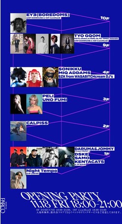 初日11月18日(金)は、館内各フロアでDJイベントをお楽しみいただける、一夜限りのオープニングパーティーを 開催。どなたでも参加可能、ドリンクを片手に音楽を楽しみながら特別な夜をお過ごしください。