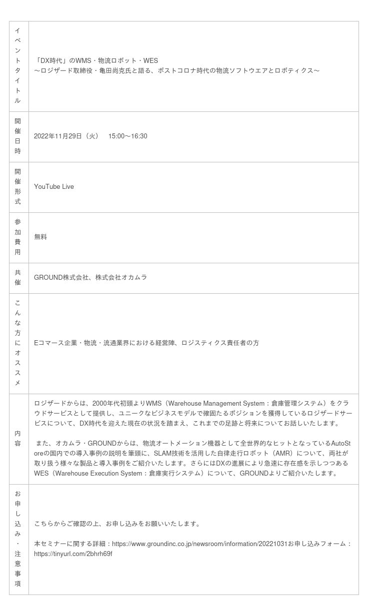 クラウド型在庫管理システムのリーディングカンパニーであるロジザード株式会社(東京都中央区、代表取締役社長:金澤 茂則、以下:ロジザード)の取締役営業部長の亀田は、2022年11月29日(火)にGROUND株式会社(本社:東京都江東区、代表取締役社長 CEO:宮田 啓友、以下:GROUND)と株式会社オカムラ(本社:神奈川県横浜市、代表取締役 社長執行役員:中村 雅行、以下:オカムラ)が共同開催するオンラインセミナー『「DX時代」のWMS・物流ロボット・WES』への登壇が決定しましたので、お知らせいたします。