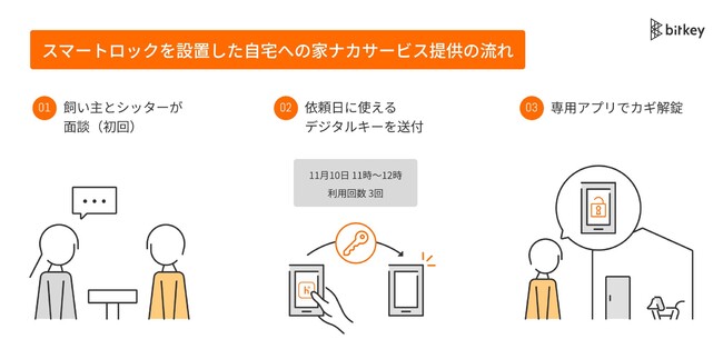 この度の取り組みでは、飼い主がビットキーのスマートロックを設置し、スマートフォンアプリ(homehubアプリ)でペットシッターにデジタルキーを送付するだけで、ペットシッターは自身のスマートフォンにてカギを解錠することができます。デジタルキーは解錠日時や利用可能な回数の制限が可能なため、ペットシッターは、サービス提供時間のみ、飼い主宅の玄関のカギを解錠することが出来ます。