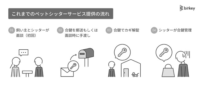 一般的に、飼い主の不在時にペットシッターを依頼する際は予めペットシッターに合鍵を渡す必要があります。加えて定期的にサービスを利用する場合は合鍵を預けたままにすることも多く、飼い主からはセキュリティへの不安の声があがるほか、ペットシッターもカギ管理が負担になっている現状がありました。