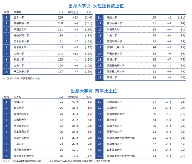 女性社長の出身大学別では、「日本大学」が前年比23人増の269人となり3年連続で最多となった。同大学においても、過去最高の女性社長数となる。次いで「慶應義塾大学」(245人、同4人増)がトップと24人差で続き、「早稲田大学」(231人、同5人増)も含め3つの大学で200人を超えた。