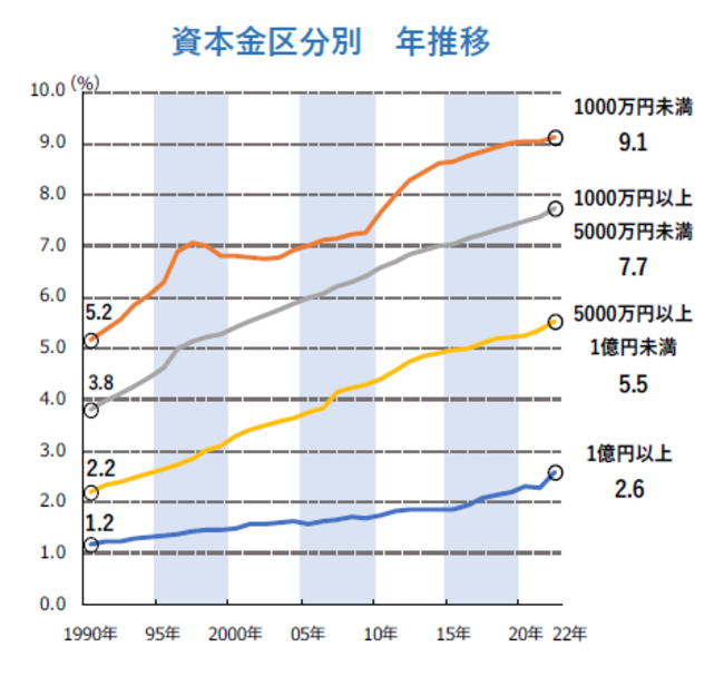 資本金区分別では「1000万円未満」が9.1%でトップ、「1億円以上」は2.6%と低水準