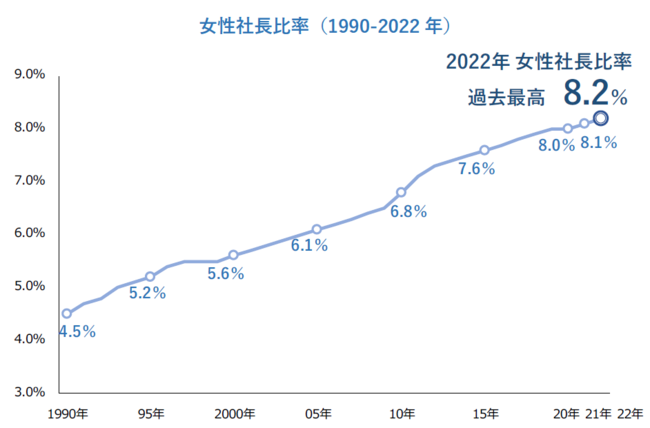 帝国データバンクが国内の女性社長比率について調査を行ったところ、2022年は8.2%だった。統計として遡れる1990年当時は4.5%であったが、2000年には5.6%、2010年には6.8%と年々緩やかながら上昇傾向で推移。