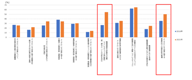 2016年時点と2021年時点のメンタルヘルス対策への取組を項目別に確認したところ、ほぼ全ての項目において数値が上昇していることが明らかになりました。