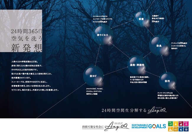 Any ∞(エニー ループ)は、繊維や壁などに噴射塗布するだけでナノレベルの分子が乾燥、強力固着し、ナノ被膜を形成し、有害物質の浄化(浄菌・浄ウイルス)、きれいな空気を生み出します。