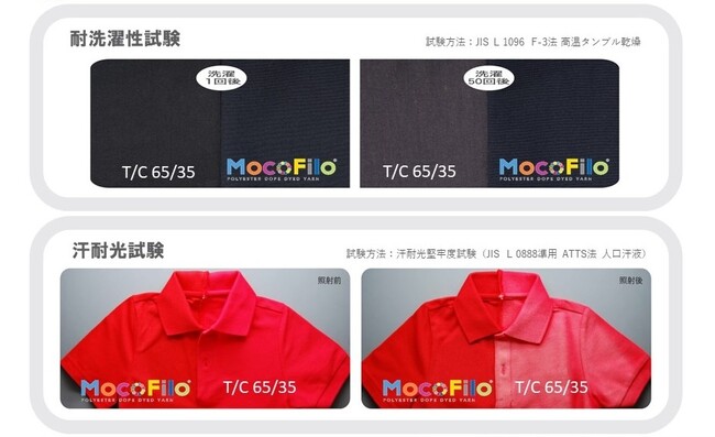 「MocoFilo」はポリエステル原料にセレクトされた高耐熱、高堅牢な色材を練り込んで着色します。