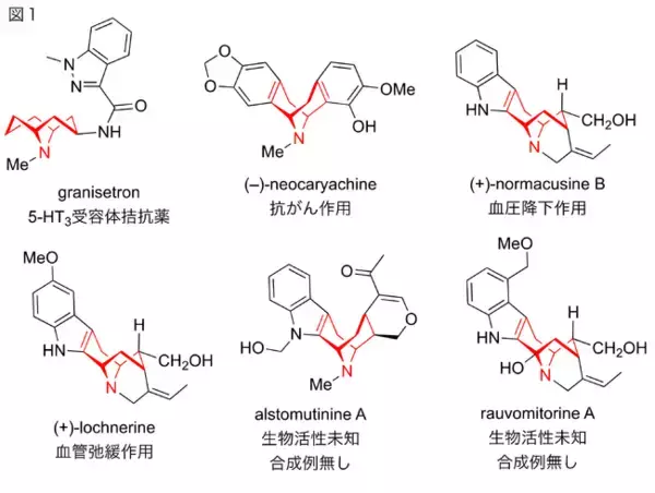 アザビシクロ[3.3.1]ノナン骨格(図1、赤色部分)は、抗がん作用をはじめとする、多くの薬理効果を示す天然有機化合物や医薬有効成分に含まれる重要な分子構造です。また、この部分にインドール環が結合した天然有機化合物も同様にさまざまな薬理効果を示すことから、創薬シーズとして注目を集めています。しかし、植物からの抽出方法が報告されたにもかかわらず、供給量が少ないせいか薬理効果の検証が十分に行われていない天然有機化合物も数多くあるため、インドール縮環型アザビシクロ[3.3.1]骨格を効率的に構築する新たな手法の開発は重要です。