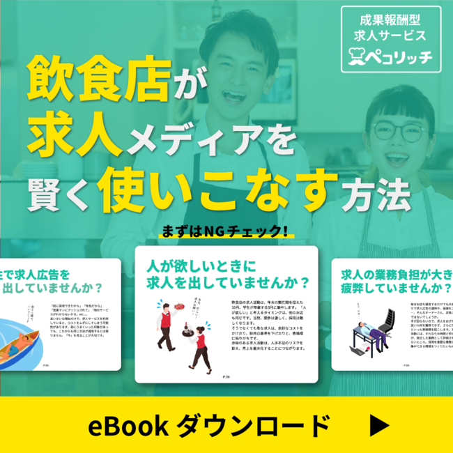 今回の大幅な事業拡大に伴い、オリジナルeBook(PDF形式)「飲食店が求人サービスを賢く使いこなす方法」を公開しました。全国の飲食店のみならず、宿泊施設や小売業の皆様にも、役立ていただける内容です。