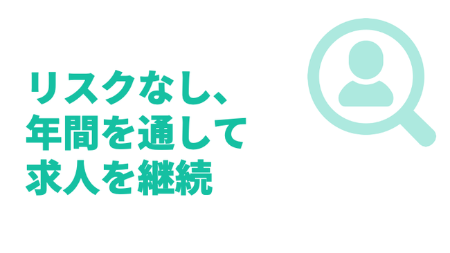 アルバイト1応募あたり4000円(税別)~と、リーズナブルな料金で、サポートは無期限で継続されます。手間やリスクなしで一年を通した求人活動が可能になり、余裕を持って応募を獲得し、そのなかから良い人材を選んで採用できます。なお、サービスの利用停止と再開は自由です。