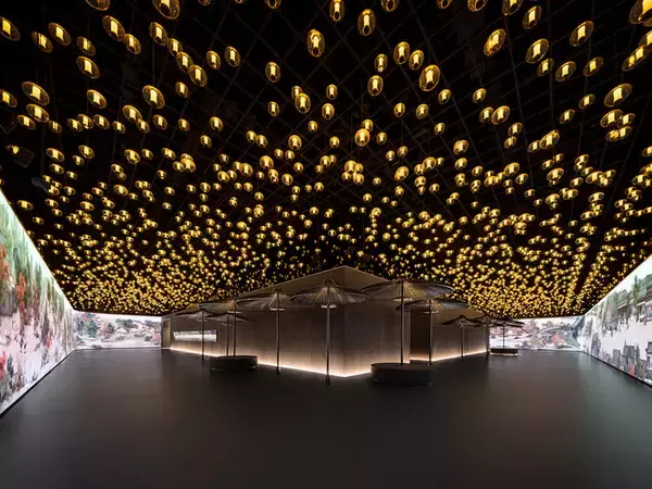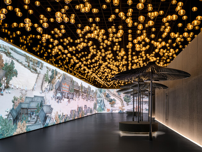 天井いっぱいに吊るされたランタンは、プログラミングで蠟燭のように優しく揺らぎ、金陵図の世界への没入感を高めています。