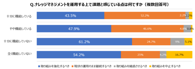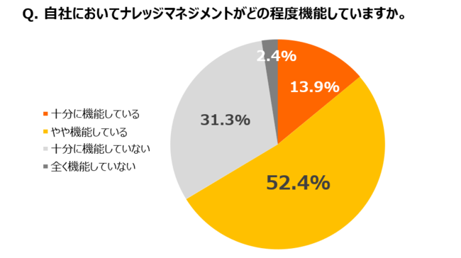 パソナJOB HUBとプライズが今年11月に共同で実施した調査によると、ナレッジマネジメントの取り組みが「十分に機能していない、全く機能していない」と答えた企業は33.7%にのぼりました。また、「十分に機能している」「やや機能している」と答えた企業においても、約半数が今後ナレッジマネジメントの取り組みを「強化すべき」と回答しており、効果的なナレッジマネジメントの実践に向けた様々な課題が明らかになりました。