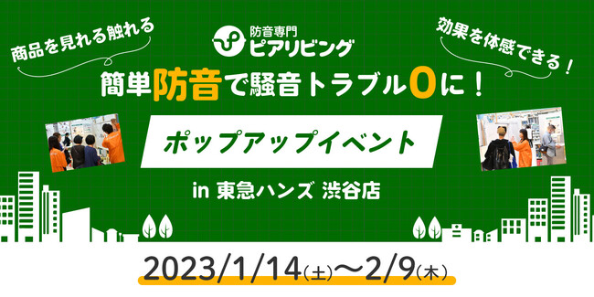 2023年1月14日(土)~2月9日(木)まで東急ハンズ渋谷店にて、期間限定のポップアップイベントを行います。ブース内では、防音商品(防音マット・防音カーテン・防音パネル等)が展示されており、一部商品については防音の体感が可能です。また、期間中は10:00~19:00まで防音相談員が常駐(※休憩で1時間程度不在の時間あり)しているため、防音のご相談も可能です。