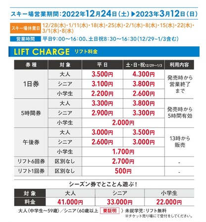 今シーズンの「あだたら高原スキー場」では、お子様にもより楽しんでいただけるよう、毎週日曜日を「こどもの日」に設定し、小学生以下のお子さまのリフト1日券が1,300円(通常料金2,600円の半額)でご利用いただけるほか、宝探し大会などの参加型イベントも期間中多数実施いたします。