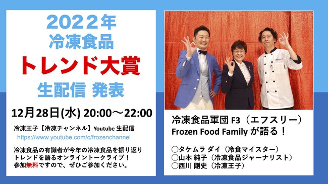 配信内容:冷凍食品の有識者3名が今年の冷凍食品を振り返りトレンドを語るオンライントークライブ。2022年冷凍食品を代表するトレンドをもとに、今年1年を振り返ります。Youtube生配信のため、無料でどなたでも参加ができますので、ぜひご参加ください。