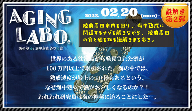 2023年2月20(月)には謎解きゲーム第2弾となる「AGING LABO.海の神秘!海中熟成酒の秘密」をスタートします。こちらは弊社が展開するお酒を海に沈めて味の変化する特性を活かした物販&観光の取組みである海中熟成のストーリーに沿った謎解きとなり、陸前高田の食と酒を楽しみ、知ることができる内容となっております。