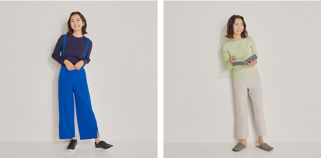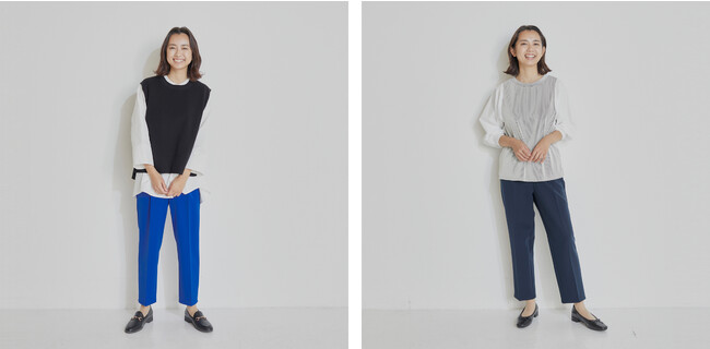 ストレッチ性や防汚撥水機能はそのままに、素材の一部に環境に優しい再生ポリエステルを使用し、シルエットも見直しました。はくだけでスタイルアップをかなえるテーパードパンツです。
