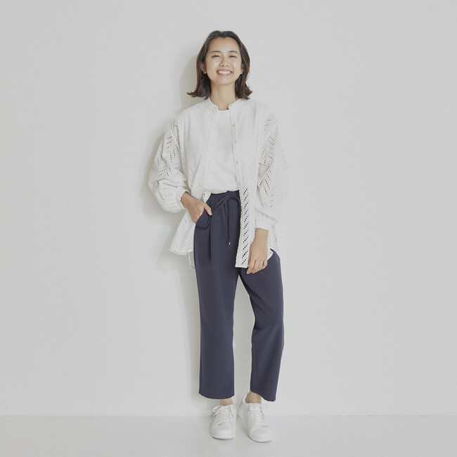 ウエストひもが付いたイージー仕様のテーパードパンツが初登場。リラックス感がありながら、程よいテーパードですっきりと見せてくれます。素材の一部に再生ポリエステルを使用しています。